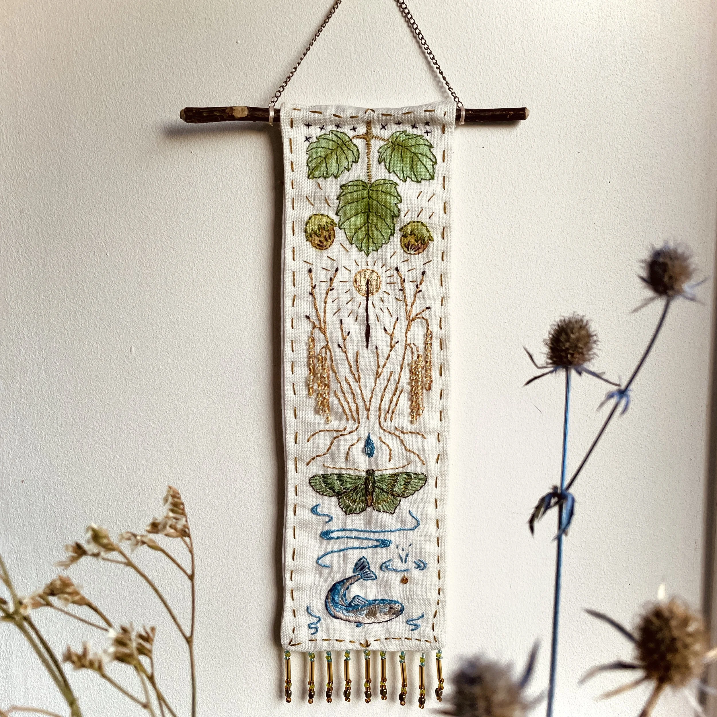 My illustrations and textile work inspire each other in texture and colour. I love this mixture of mediums as I feel it adds depth and invites closer engagement with the details of nature that fascinate me. I mainly work in the form of textile wall hangings and hoops using up-cycled textiles as well as watercolour illustrations on paper.